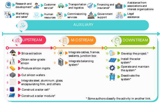 Authors such as [27,28] identify the construction of the balance of system (electrical components that facilitate the operation of the modules) within this context. Nevertheless, a larger number of authors categorize it in the subsequent link. The authors of [28] categorize research and development activities and the installation of the photovoltaic system in the primary link, although other authors classify them in the auxiliary and downstream links, respectively, as will be demonstrated subsequently.