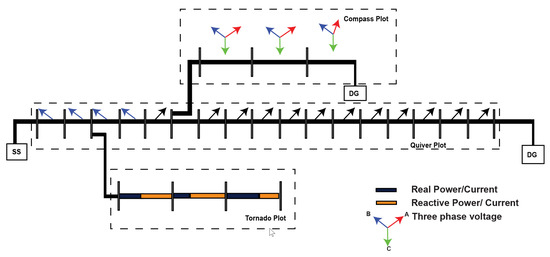 A compass plot is a graphical representation of the three-phase voltage phasors in a power system [43,44]. The compass plot can be used to visualise the magnitude and phase angle of the three-phase voltage phasors relative to a reference axis. By creating a compass plot for three-phase voltage, operators can quickly detect any imbalances or phase shifts in the voltage phasors, which can be indicative of power quality issues or other problems in the power system. The compass plot can be used to diagnose these issues and take corrective actions to ensure a stable and reliable power supply. Figure 2 shows the compass plot in one lateral of the sample distribution system. As can be observed, the compass plot shows the phase change in line current. Hence, corrective measures can be applied in those line sections to ensure the reliability of the system.