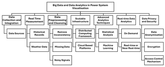 Understanding the concept of big data is essential in interpreting its impact on power systems. This section delves into the pivotal role of big data and data analytics in visualising power systems with main focus on different stages such as data collection and integration, data preprocessing and cleansing, scalable infrastructure, advanced analytics techniques, real-time data analytics and data privacy and security, as shown in Figure 3.