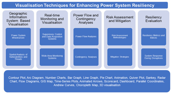 This section discusses various visualisation techniques that have been effective in bolstering power system resiliency and their specific applications, as shown in Figure 4. In resilience-driven power systems, deciphering data through visuals provides significant benefits, including real-time monitoring, dynamic resilience assessment, targeted resilience optimisation, decision support, user-friendliness and the development of a standardised resilience metric. The consequent improvement in understanding, managing and enhancing the resilience of power systems ensures reliable and robust power system operations.