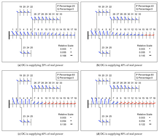 As illustrated in Figure 6, when DG is supplying 20% of real power, the current reversal occurs until Section 8 of the line and there is no voltage violation in the network. Though there is a current reversal, DG supports the network by increasing the voltage level. However, when DG penetration is increased from 20% to 40% and 60% of total load, the sphere of influence of DG connected at bus 18 can be seen until bus 6 and exceeds the voltage threshold limit. For 40% of the load, the voltage violations are seen at buses 16, 17 and 18 and a greater number of buses, from 10 to 18, deal with voltage violation for 60% of the load. In the case where DG is supplying 80% of the load, the impact of DG is increased further until Section 3 of the line and voltage violation can be seen from buses 9 to 18.