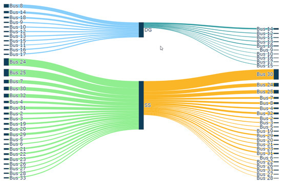 A Sankey chart is a type of visualisation that helps to visualise the flow of power from source to node. By analysing the flow of power from source to node, the impact of DG on the buses in the close vicinity and bus served by grid or respective DG can be determined. Further, network partitioning insights can be viewed intuitively and quickly through this visualisation approach.