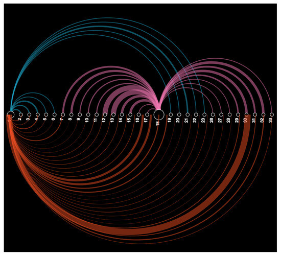 An arc diagram is a data visualisation technique that is commonly used to display network data [55]. It is particularly useful for visualising the connections between nodes in a network, as well as the flow of data or other quantities between nodes. In the context of power networks, an arc diagram can be used to visualise the flow of power between various nodes in the network, with colors representing different zones. By creating an arc diagram for a power network, operators can gain insight into the flow of power through the network, identify bottlenecks and other issues that could impact system stability, and plan system expansions or upgrades to improve the network’s efficiency and reliability. The results shown in Figure 8 portray the illustration of the sphere of influence of the DG in the 33 bus distribution systems connected at bus 18. As DG supplies 50% of the real power, the contribution of DG in the respective nodes from buses 7 to 18 and laterals 26 to 33 is clearly visible in the diagram. All other buses are served by the grid. Since the DG supplies only real power, all buses are served by the grid for the reactive power demand. This diagram can be incorporated with a geographical information system to address the necessary action required in the event of congestion and determine the critical node that needs immediate attention and the source of issues.