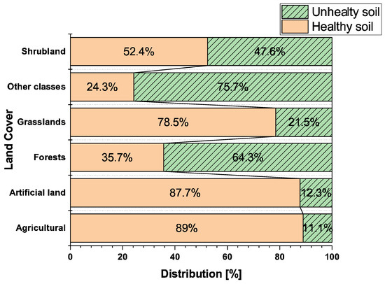 Distribution of healthy and unhealthy soils per Corine land cover class. Reproduced with permission of [21,22].
