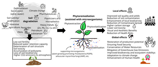 Beyond soil purification, phytoremediation contributes to erosion control and prevents the dispersion of pollutants into aquatic and atmospheric environments [50]. Given its versatility, phytoremediation can be integrated with other remediation methods and has low infrastructure requirements compared to chemical soil treatment as it does not necessitate the construction of complex treatment facilities. Additionally, phytoremediation offers further benefits, such as promoting biodiversity, in contrast to conventional remediation methods. It also provides an opportunity to revitalize extensively degraded areas, with the added advantage of being widely accepted by society due to its environmentally friendly and aesthetically pleasing nature [51]. A schematic presentation of the role of phytoremediation in environmental protection on both local and global scales is shown in Figure 2.