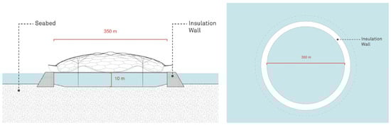 For this project, the technology that has been identified as a reference for thermal energy storage consists of large structures inside the seabed as shown in Figure 1. These capture volumes of water, insulating them from the rest of the sea and constituting an artificial island, both reducing construction costs and having a positive impact on the city by providing extra space for human activities. Such large cylinders filled with seawater could have diverse structures, ranging from excavated to floating, being like an artificial island and making use of seawater as a storage medium; see Figure 1. The operational characteristics of our proposed design, including cost parameters, are based on the previous research conducted by Carlo Ratti Associati and other partners for the “Hot Heart” project in Helsinki [1]. The working principle is similar to a standard pit heat storage, whereby most of the pit already exists thanks to the sea, and furthermore, we do not run into the typical problems of densely populated cities where there is no space available. Such TES ensures a long duration of stored energy up to seasonal heat storage [8]. In fact, pit thermal energy storage systems conventionally work by storing thermal energy in a borehole or pit that is dug deep into the ground, with a solid or liquid, such as water, storage medium. During times of excess energy a heat source—either thermal such as a solar collector, or electric via a heat pump—is used to accumulate heat energy in the pit. The heat energy is in fact transferred via an intermediate fluid, thermal vector such as water or antifreeze, and heat exchanger to the surrounding ground or underground water acting as the storage medium. When heat is needed, the thermal energy is retrieved from the ground by circulating the thermal vector through the heat exchanger in the pit. The fluid absorbs the stored thermal energy from the ground, which is then transferred to the district heating network, which is used for transferring heat to the city.