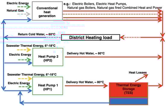 Overall, as we will show, TES allows to better capture the economic benefits from the coupling of electricity and thermal energy infrastructures, and thus the markets, by providing a way to buy or make use of self-produced electricity when it has lower cost, or even negative prices in the case of large overproduction in the region, and converting it to thermal energy, which can be stored at the costs lower than those for electricity storage and later sold or utilized as heat to customers when needed. The combination of TES with district heating becomes particularly convenient in comparison to what private citizens could implement independently, given the larger volume of heat involved, and thus the scale effect, more regular clustered consumption profiles, and also a larger variety of renewable energy sources that could be adopted, as well as heat generation units such as the seawater industrial heat pumps in our case.