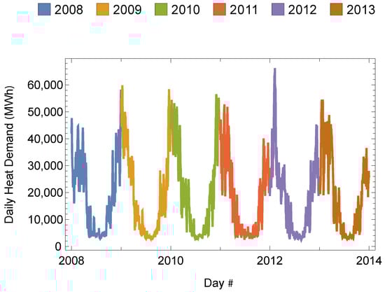 In a real-life scenario, heat demand is not perfectly known in advance. Hence, optimizing the operation schedule of the thermal storage requires forecasting the demand. As our ground truth data on heat demand, we take the historical national heat demand profile for space and water heating available from [11], which computes heat demand profiles for the Netherlands by combining gas standard load profiles with the spatial temperature and wind speed reanalysis data as well as population geodata. Because we do not have access to the ground truth demand data in Amsterdam, we rescale the national estimates provided in [11] to match the total annual heat demand of Amsterdam (20300 TJ according to the “Amsterdam Heat Guide” report [10]), dividing it across the year in a way that matches the seasonal profile of the heat demand in the Netherlands. The resulting heat demand profiles from 2008 to 2013 are shown in Figure 3.
