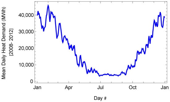 To reflect the dependence of the heat pump COPs, and , on the variations in seawater temperature during the year, we use a well-established approximation that consists of the ideal HP efficiency, namely, the Carnot heat pump COP operating between these two temperatures, and thus the function of the temperature lift we want to provide, which has been multiplied by the second principle of thermodynamics efficiency assumed to be constant, equal to 0.4. Considering that a detailed model of the HP is not the object of this work and that the temperature lift is always below 80 °C, it is considered an acceptable approximation [20]: