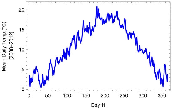 We choose the year 2013 as the case study for our forecasting model since it is the latest year available in our data. The forecast is constructed in three steps. First, we obtain the historical average mean demand for each day, using data for years 2008–2012, shown in Figure 4. In the second step, we take the historical daily ambient temperature data for Amsterdam (Figure 5) between 2008 and 2012, and estimate a regression model that predicts the deviations from the historical average mean heat demand using the corresponding deviations of the temperature from its historical average. The historic average temperature trend is shown in Figure 5, and the regression fit is shown in Figure 6.