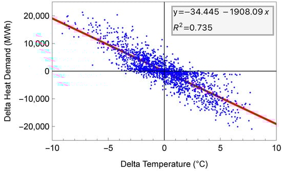 The linear model shown in Figure 6 obtains a very high R-squared of 0.74. Therefore, we show that if the outdoor temperature is known perfectly in advance, one could predict the heat demand with high accuracy using the following equation: