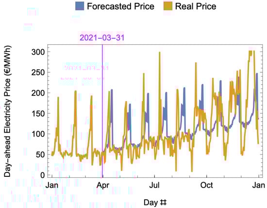 Autoregressive models serve as the backbone of all statistical models of electricity prices, where no auxiliary data are required [14]. In particular, SARIMA models have been found effective in this context, and often serve as a baseline comparison for the more sophisticated data-driven methods [15,16,17,18]. We fit a SARIMA time-series process with two autoregressive lags and a seasonality component (of 32 days) on the price data from 2020. Then, for each given start date in 2021, we use a moving window of 60 days prior to this start date to obtain a forecast of the prices for the future dates in 2021, using the fitted SARIMA process to obtain the predictions. An example of applying the resulting forecasting model is shown in Figure 8.
