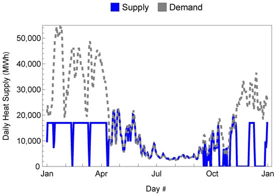 In what follows, the economic model considers the following inputs for each time period : , , and , which are the temporal data on electricity prices, fixed heat prices (EUR 47.38 per GJ), and city heat demand over the course of a year. In the first part of our analysis, we choose the model to be simulated at the daily frequency level. Later, in Section 3.3, we explore the more granular model, allowing for within-day load shifting.