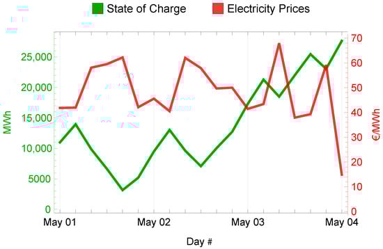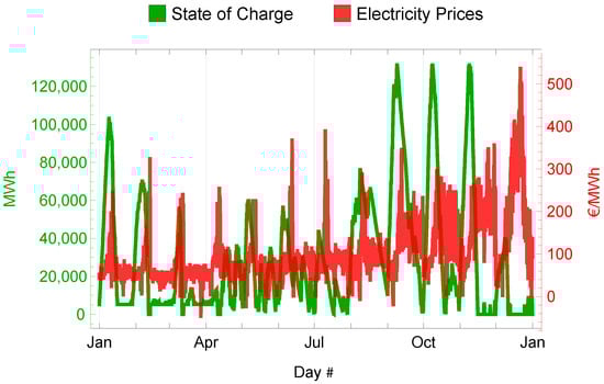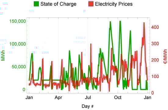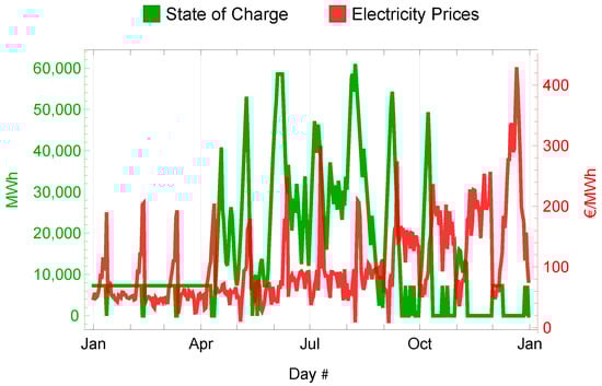 Figure 9 and Figure 10 present the key simulation results. We see that given the 2021 electricity and heat prices in the Netherlands, it would be economically viable to supply a substantial share of the total heating demand via the proposed seawater-cooled heat pumps; see the blue line. They are not utilized, in correspondence with the electricity price peaks, or else they are often at maximum power. We can also see that the optimal charging of the storage closely follows the electricity prices and exhibits a pattern that varies within the year. More in detail, we can see that it is charged before reaching peaks of electric energy costs and accordingly deeply discharged with the price surge. It happens about 10 times in a year, confirming the long-duration impact of this kind of energy storage, heat storage, which indirectly means electricity storage. This is the best trade-off between the price of electricity, helped by the better COP of the HPs in the hot periods, and the losses determined by keeping the storage filled, as it does not make it profitable to have it full for too long of a period, at 1 per cent of the stored energy each day.