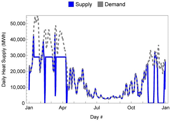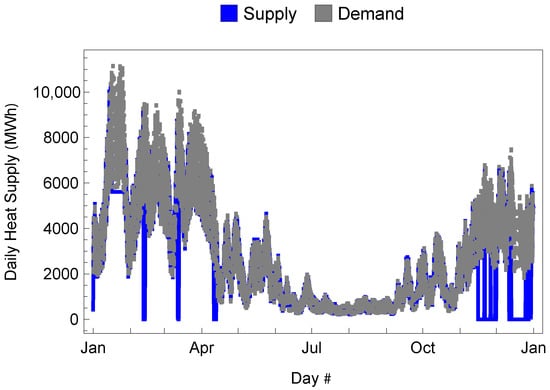 The maximum amount of energy resulting from the optimization of the storage size is the outcome of the optimization model. The specific heat of water is equal to 4.186 kJ/kg·K, and the difference in temperature between storage delivery (80 °C) and return (60 °C), , is conservatively assumed to be 20 °C, but the return could actually be at a lower temperature.