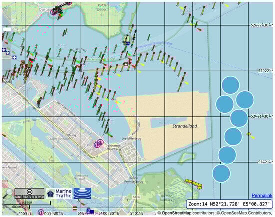 This calculation gives us between three and seven islands. Such islands can hypothetically be placed to the east of the city center in the waters of IJmeer bordering Strandeiland as shown in Figure 17. One particular advantage of such a location is the proximity to the existing district heating network that connects Rieteilanden with the rest of the city. This is performed consistently with the marine traffic data taken from openseamap.org (accessed on 16 Septemver 2024), and placing all the islands jointly with the large centralized HP solution, to see its footprint. Such placement of the islands also benefits from the sea depth of around 8–9 m to the east of Strandeiland, meaning that only minimal excavation will be required. Nevertheless, in a real expansion and electrification of the Amsterdam district heating, we can foresee as a better solution smaller distributed HPs, and therefore distributed and eventually smaller artificial islands, so as to reach a better optimum with respect to the integration in the heat network, despite a slightly higher investment cost due to the higher number of smaller units.