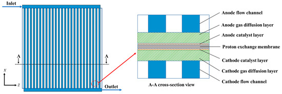 The three-dimensional computational domain depicting PEMFC assembly is illustrated in Figure 1, comprising sequentially stacked flow channels (FCs), gas diffusion layers (GDLs), catalyst layers (CLs), and proton exchange membranes (PEMs). Geometric parameters of each component are detailed in Table 1. The reactants are introduced through a single main inlet and subsequently branch into 25 tributary channels. All channels are characterized by a rectangular cross-section. After engaging in the electrochemical reaction, they are discharged from the main outlet. For the purpose of facilitating clear and concise description, these tributary channels are sequentially numbered from 1 to 25 along the direction of the primary flow path (z-axis positive direction). To simplify the modeling and calculation, the following assumptions, commonly used in existing studies, are made: (1) the PEMFC operates under steady-state conditions; (2) all the gasses participating in the reaction are considered ideal gasses; (3) the water within the flow channel exists in the form of extremely fine droplets, and its flow velocity is consistent with that of the gas; (4) the materials utilized in the gas diffusion layer and the catalyst layer are treated as isotropic porous media; (5) the flow is assumed to be an incompressible laminar flow.