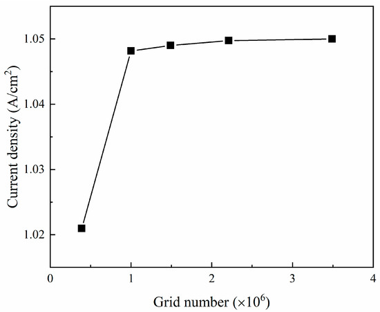 To verify the independence of the computational grids used in the numerical simulation, current densities were calculated for four distinct grid configurations at a voltage of 0.6 V. The results are presented in Figure 2. When the grid numbers were 2.2 million and 3.5 million, respectively, the relative error in the calculated current density at 0.6 V was below 0.01%. To balance computational accuracy and efficiency, the computational models in this study employed a grid count of 2.2 million.