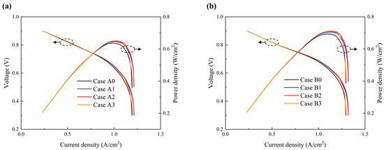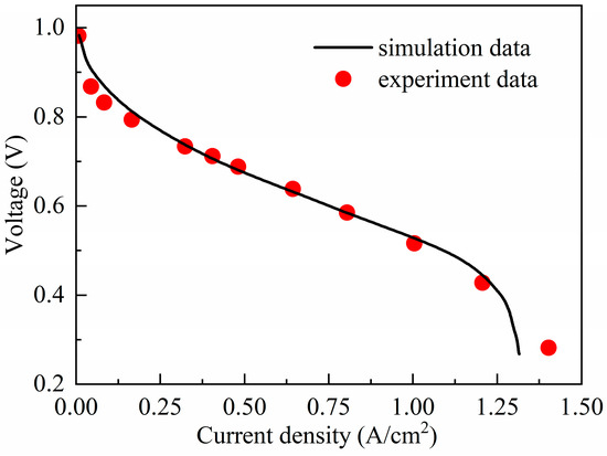 To further validate the effectiveness of the computational model, a single-channel PEMFC model was established according to Ref. [38]. The fuel cell operates under the following conditions: an operating temperature of 353.15 K, an ambient pressure of 1 atm, an anode stoichiometric coefficient of 2, a cathode stoichiometric coefficient of 1.5, an anode relative humidity of 84%, and a cathode relative humidity of 59%. As presented in Figure 3, the polarization curves exhibit strong consistency between numerical predictions and experimental data [38]. The maximum relative error is about 6%, which confirms the reliability of the simulation model developed.