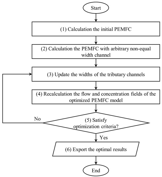 The cross-sectional area of each tributary channel directly influences the mass fraction of reactants at its exit, which further reflects the concentration uniformity of reactants diffusing to the catalyst layer and the output performance of the PEMFC. Therefore, the uniformity of reactant distribution and power output can be regarded as an optimization principle, and the oxygen flux at the outlet of each tributary channel can be regulated by adjusting the width distribution of these tributary channels. Specifically, if the outlet concentration of tributary channel k in the j-th iteration is lower than the average outlet concentration of all tributary outlets, the width of this tributary channel is increased to enhance its outlet concentration; conversely, if it is higher, the width needs to be decreased. This process continues until the reactant distribution reaches the highest level of uniformity achievable.