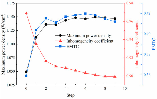 To validate the efficacy of the evolutionary algorithm, Figure 5 depicts the variations in the maximum power density (Pmax), the inhomogeneity coefficient of the gas diffusion layer (ωGDL), and the effective mass transfer coefficient (EMTC) with respect to the number of iterations. The results reveal that, as the number of iterations increases, the maximum power density and the EMTC of the proton exchange membrane fuel cell (PEMFC) exhibit an upward trend, whereas the inhomogeneity coefficient shows a downward trend. This suggests that the evolutionary algorithm enables the PEMFC to achieve a more uniform reactant distribution, enhanced mass transfer capability, and higher output power. Based on the optimality principle established in the previous section, the model corresponding to the 7-th iteration is identified as the optimal model. When compared with the PEMFC featuring equal-width channels, the PEMFC with optimized-width channels demonstrates a 9.3% increase in the maximum output power, a 7.2% reduction in the inhomogeneity coefficient, and a 14.8% enhancement in the effective mass transfer coefficient.