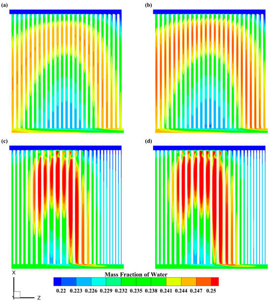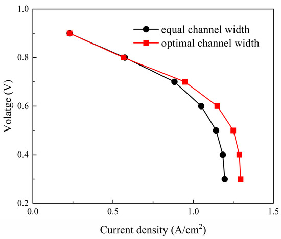 After obtaining the optimal non-equal-width channel distribution, we analyzed the performance before and after optimization. The polarization curves of the model with equal-width channels and the model with optimized channel widths are presented in Figure 6. The results indicate that, at low current densities, there is scarcely any difference in the output performance between the two models. Nevertheless, at medium to high current densities, the optimal distribution of channel widths leads to a remarkable improvement in the output performance of the PEMFC. Specifically, at a voltage of 0.3 V, the current density of the optimal model is 8.3% higher than that of the equal-width channel model.