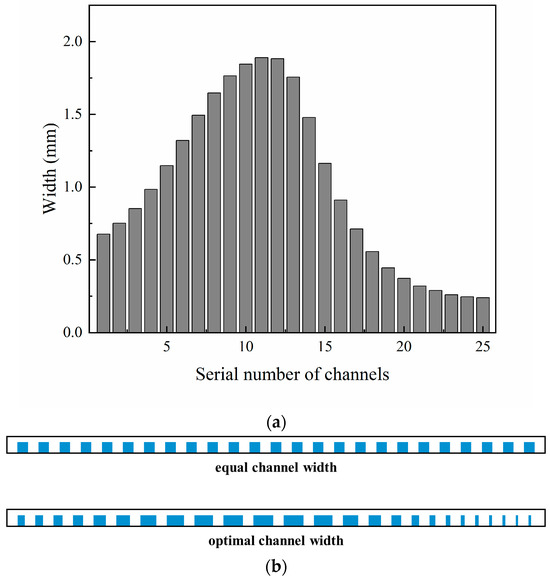 The channel width distribution of the optimized model: (a) the widths of each tributary flow channel; (b) the comparison of the equal-width channel and the optimal channel.