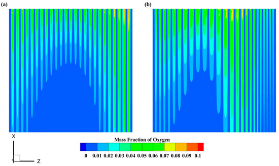 The oxygen distribution at 0.3 V of the (a) equal-channel-width model and (b) the optimal model.