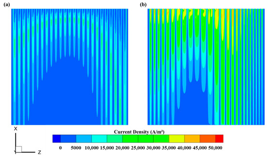 The current density at 0.3 V of the (a) equal-channel-width model and (b) the optimal model.