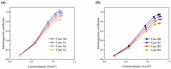 The curves of the inhomogeneity coefficient and the EMTC at various current densities are shown in Figure 7. From the graph, it can be observed that, at low and medium voltages, the EMTC of the optimal model is significantly higher, and the inhomogeneity coefficients are notably lower compared to those of the equal-width channel model. This suggests that the optimization of the channel widths substantially enhances the mass transfer capability of the PEMFC, improves the uniformity of the reactant distribution, and ultimately boosts the output performance.
