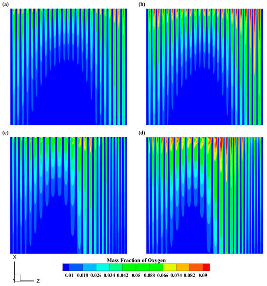 where Q represents the mass flow rate; k denotes the tributary number; and Y is the average concentration of oxygen. The superscripts cos, in, and out signify the consumption of reactants, the inlet condition, and the outlet condition, respectively, while the subscript tot represents the sum of the values for all tributaries. Given that the inlet concentration of each tributary can be regarded as approximately identical, the average outlet concentration of all tributary channels can then be calculated using the following equation: