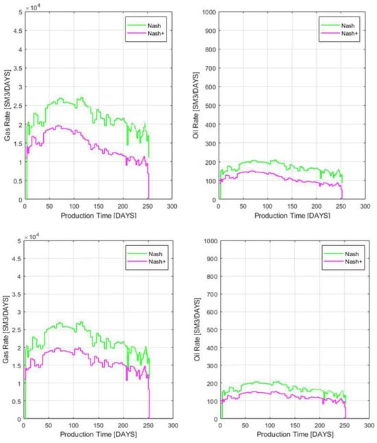 In Case 2, the well’s vertical and horizontal lengths are reduced to 50% of their original values. The original vertical length of the well is 8500 ft; hence, taking half of this length results in a new vertical section measuring 4250 ft. Correspondingly, the horizontal section is reduced to 3500 ft. Given that the impact of the horizontal length on the production rates has been established as minimal, this case primarily concentrates on the effects of reducing the vertical section. Figure 7 (middle) shows oil and gas production rates for Case 2. Compared to the original case depicted in Figure 8, the production rates for both oil and gas in this adjusted case using NaSh+ are more closely aligned with the NaSh results, represented by the green line. With the reduced measured depth, the fluid now travels through shorter distances. This reduction in distance is expected to decrease the resistances caused by the wellbore flow; these resistances are a result of the reduced interaction between the fluid and fluid and the fluid and wall. As a result of the decreased resistances, there is a corresponding increase in the production rates of both gas and oil. This enhanced production efficiency is represented in the plot by the magenta line. This scenario underscores the critical role of wellbore dynamics in hydrocarbon extraction. By manipulating variables such as the measured depth, significant improvements in efficiency can be achieved numerically.