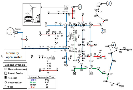 As in our previous study, we assume that switches 38–46, 63–76, 78–69, and 90–119 are normally open tie switches connecting five feeders before optimization. These switches serve as critical network components that can be toggled to alter the system configuration and optimize power flow. The status of these switches is important in the optimization process, as their operation directly affects the distribution network’s efficiency, especially in terms of power loss reduction and voltage regulation.