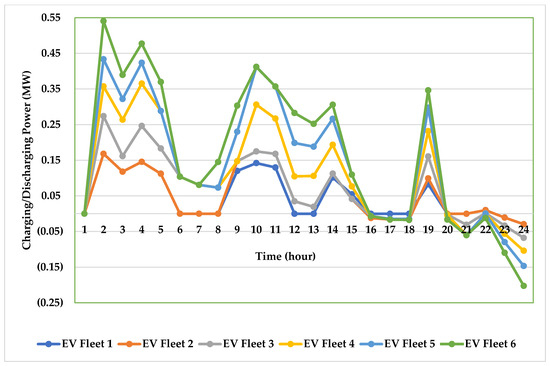 Figure 2 visually illustrates the EV charging and discharging power over the 24 h simulation period. In the figure, positive values represent power being supplied from the grid to the EVs (charging), while negative values indicate power being discharged from the EVs back into the grid (discharging).