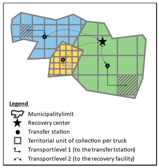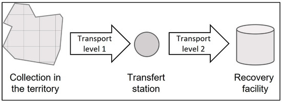 As can be seen in Figure 2, the territorial aspect plays a double role in the recovery process: on the one hand, transport level 1, which represents the collection and transportation of the organic waste in the territory to the transfer station, and, on the other hand, transportation level 2, which represents the transportation of the organic waste from the territory to the recovery facility. The waste management system could benefit from the use of different transportation methods accounting for the territorial morphology and population density [22]. It has been established that waste collection and transportation are related to the parameters of waste generation in the territory, so the transport structures need to be adjusted to the city’s structures and population distribution [23].