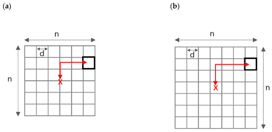 Configuration breakdown grid type (n × n) centred on the recovery facility with the cell unit of collection represented by d2 dimensions for both configuration types: (a) even or (b) uneven number of units in the grid to travel from the unit cell to the digester.
