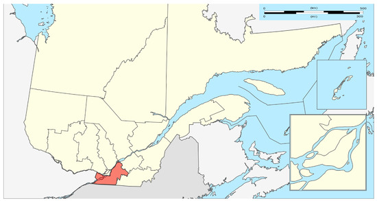 Location of the Montérégie region (in red) in the province of Québec, Canada (data from [35]).