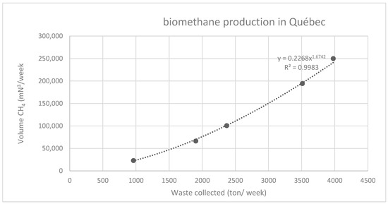 The data of the province of Québec, Canada [27] are used to study the biomethane recovery process. There are 12 projects of biomethane recovery and composting approved in the province of Québec under the government program to process organic material. Only data from those projects are available on the government database [27], and only five of these projects produce biomethane from municipal solid organic waste, without considering composting projects or ones processing municipal slurry. The data of different anaerobic digesters for biomethane recovery operated in real conditions in the province of Québec are used to calculate the volume of biomethane produced, which is shown in Figure 7.