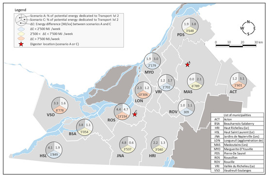 This research considers the technological aspects of the waste management process, and future research on economic aspects of changes in the location of the biomethane recovery facilities and the transport structure should be conducted. Nonetheless, energetic analysis without including the economic aspect allows for identifying the economic cost of an environmental improvement and thus making an enlightened decision. The importance of this approach was demonstrated using the data of the Montérégie region in Québec and using plausible transportation methods. However, payloads, transportation methods and recovery technologies can be changed to suit other materials, cities or environments. Many countries have developed new technologies for smaller digesters, which can be installed [39] without compromising the efficiency of biomethane recovery. Even if the technology is available in biomethane recovery to install smaller digesters, encouraging social acceptance of the anaerobic digester is a difficult step for many territories [40].
