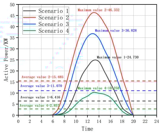 Using PVsyst software, a simulation of the photovoltaic (PV) power generation system in a specific region was conducted, obtaining annual PV output curves and related data. Based on these simulated data, a clustering analysis method was employed to thoroughly analyze the annual power generation characteristics of a single set of PV panels. Ultimately, four representative typical power generation scenarios were extracted (the data are detailed in Table A1 of Appendix A).