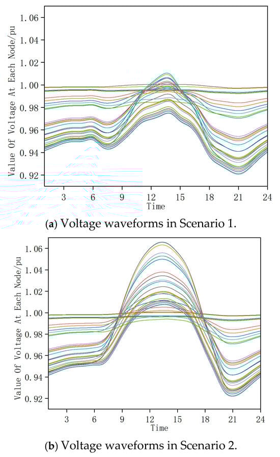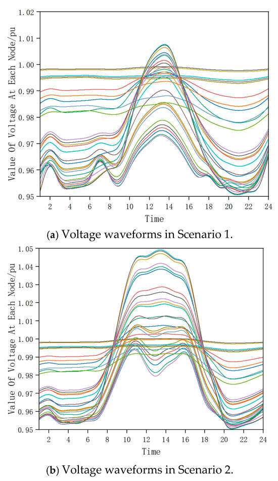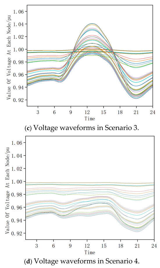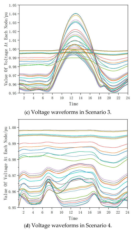 Figure 5 shows the node voltage waveforms for the first four scenarios of energy storage configuration, highlighting the impact of PV generation on the voltage distribution. In Scenario 2, which represents the days with the highest PV output, certain bus voltages exceeded the upper limit at midday due to reverse power flow from the distributed PV systems. Conversely, during the evening peak load period, voltages dropped below the lower limit, especially in Scenarios 3 and 4, where PV output was minimal. These voltage violations underscore the need for energy storage systems to mitigate overvoltage and undervoltage issues. The differences in the voltage profiles across the scenarios emphasize the importance of a multi-scenario optimization approach to ensure robust energy storage performance under varying PV and load conditions.