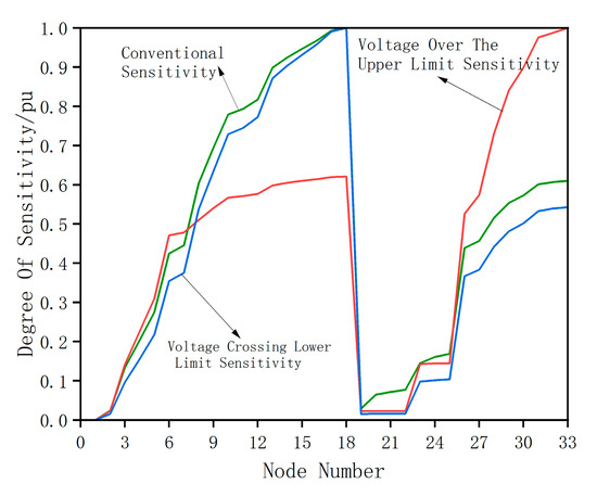 As shown in Figure 6, the voltage sensitivity calculated by the proposed method was significantly higher than the traditional sensitivity near Node 30 for the upper voltage limit. This is because most photovoltaic systems in the improved IEEE 33-node system are connected near Node 30. The rapid increase in photovoltaic output at noon caused current reverse flow on the branch between Nodes 26 and 33, leading to voltage violations.