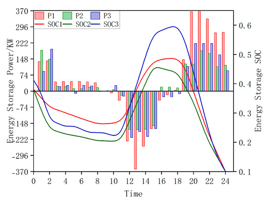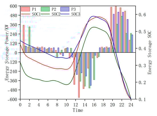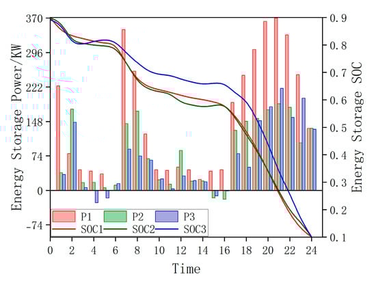 The actions and SOC of the energy storage device in Scenario 2 are shown in Figure 8. Among them, P1, P2, and P3 represent the power of Energy Storage 1, Energy Storage 2, and Energy Storage 3, respectively, while SOC1, SOC2, and SOC3 represent the state of charge (SOC) of Energy Storage 1, Energy Storage 2, and Energy Storage 3, respectively.