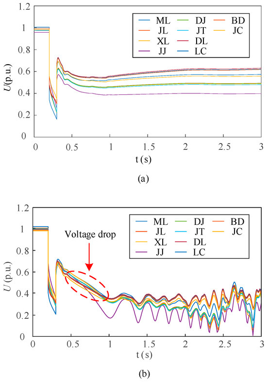 Based on the above mathematical model, the power angle and voltage instability characteristics can be analyzed. A direct ground fault is applied, and after 0.6 s, the fault is cleared, resulting in the power angle and slip trajectories under different generators’ capacity and load levels, as shown in Figure 5. In Figure 5a, when the local generators’ capacity is low, the system’s voltage support capability is weak, and the slip variation is large after the fault. As the load PL increases, with a fixed generators’ capacity, the motor becomes unstable faster, while the local generator’s power angle oscillation is relatively small. In this case, load instability dominates the system’s in-stability. As shown in Figure 5b, with an increase in PL, while keeping the generators’ capacity fixed, the power angle swings more significantly after the fault, and the load also becomes unstable. In Figure 5c, when both the generators’ capacity and load power are low, the system recovers stability. In summary, with changes in the ratio of generators and loads, the degree to which the power angle and load contribute to instability varies.