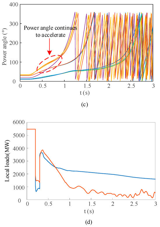Figure 2. Local generator power angle, system voltage, and local load curve. (a) System voltage curve with a low number of local generators. (b) System voltage curve with a low number of local generators. (c) Power angle curves of local generators with a high number of local generators. (d) Comparison of load power under different local generator levels.