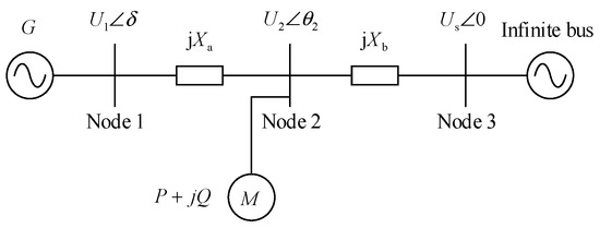 First, the simplified system model shown in Figure 4 is established. In the figure, node 1, where the generator G is located, is connected to an infinite bus system through the reactance Xa and Xb, with U1 δ representing the generator’s equivalent internal voltage. Node 2 represents the motor node, with voltage U2 ∠ θ2, while node 3 represents the infinite power source with voltage Us ∠ 0.