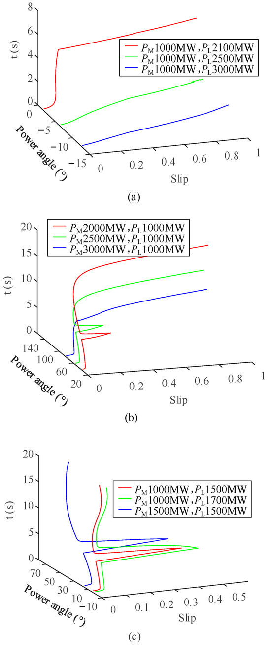 Figure 5. Power angle and slip variation curves over time under different cases of PM and PL. (a) Fixed PM, only changed PL. (b) Fixed PM, only changed PL. (c) Fixed PM, only changed PL.