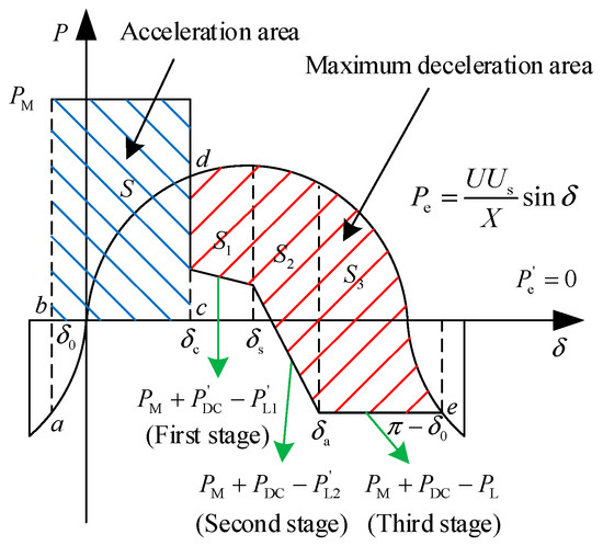 For the second and third stages, the deceleration areas of the system are calculated as per Equation (15). To maintain transient stability, the system’s accumulated acceleration area should be smaller than the deceleration area: