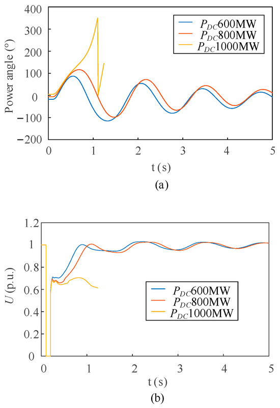 Keeping the total DC power and local generators’ capacity unchanged, as shown in Figure 13, an increase in DC power results in a reduction in the local generator’s power angle oscillation amplitude after a fault, thereby improving the system’s transient stability. However, as local generators decrease, the system’s voltage support capability is weakened, worsening the voltage stability. When the DC power becomes excessively large, the system becomes unstable after the fault, as illustrated in Figure 14.