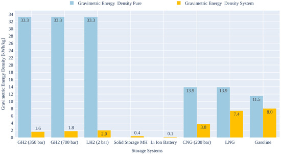 In its pure form, hydrogen possesses a high gravimetric energy density [81,97,98,99]. However, the gravimetric energy densities achieved in practical applications are significantly lower. This reduction is primarily due to storage system specifications. For practical applications, hydrogen must be stored within a tank. In the case of compressed gaseous hydrogen (CGH2), pressure is a major factor influencing the gravimetric energy density [100,101]. However, there are several considerations regarding pressure and tank design [102,103,104,105,106,107]. Firstly, there is a technical limit on how much pressure can be contained within a tank. Secondly, higher operating pressure exerts more stress on the tank, dictating appropriate tank materials [44,108,109,110]. Furthermore, the mass necessary for pressure containment reduces the overall gravimetric energy density of the hydrogen storage system, as the tank’s mass does not contribute to the energy content. Consequently, if the tank is very heavy but does not allow for the storage of much hydrogen mass, the resulting gravimetric energy density is low. A comparison of gravimetric energy densities between pure forms and practical storage systems for commonly used fuels is presented in Figure 3. In this figure, the suffix G denotes a gaseous state, L denotes a liquid state, and NG denotes natural gas.